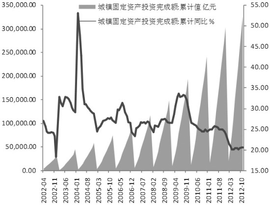 下游需求是引導(dǎo)工業(yè)品價(jià)格的主要因素,而基建和房地產(chǎn)是引導(dǎo)鋼價(jià)走勢(shì)主導(dǎo)因素,從最近召開(kāi)的中央經(jīng)濟(jì)工作會(huì)議來(lái)看,2013年基建和房地產(chǎn)投資會(huì)好于2012年。2012年三季度開(kāi)始,新的基建項(xiàng)目包括鐵路、機(jī)場(chǎng)、水利等開(kāi)始密集開(kāi)工,2013年會(huì)存在階段性施工高峰期。截至11月份,城鎮(zhèn)固定資產(chǎn)投資增速為20.7%,低于去年同期24.5%的水平,全年投資增速基本維持在20%—21%之間,預(yù)計(jì)2013年投資增速會(huì)重回到25%附近。