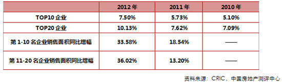 表2:2010-2012年企業(yè)銷售面積集中度及增速情況