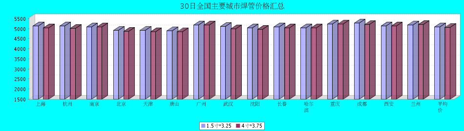 1.5寸*3.25焊管平均價(jià)格5097元/噸,與上一交易日價(jià)格下跌1元/噸,其中唐山上漲10元/噸,哈爾濱下跌30元/噸;