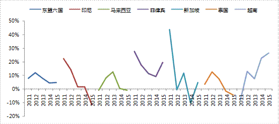 2015年,雖然東盟地區(qū)鋼材消費(fèi)量再次增長(zhǎng),但增速僅較2014年的4.4%微增0.2個(gè)百分點(diǎn),增速出現(xiàn)放緩跡象,其中,對(duì)東南亞鋼材消費(fèi)拖累最大的是印尼和泰國(guó)。作為東盟地區(qū)主要的兩大鋼材消費(fèi)國(guó),近年泰國(guó)與印尼鋼材消費(fèi)增長(zhǎng)逐年下降。2015年印尼鋼材需求大幅下滑12%,降至1138萬(wàn)噸,泰國(guó)鋼材消費(fèi)量同比下降4.4%至1655萬(wàn)噸。而越南同比大幅增長(zhǎng)26.4%,一躍成為東南亞地區(qū)最大的鋼材消費(fèi)國(guó),且鋼材消費(fèi)量增速呈逐年加快之勢(shì)。菲律賓鋼材消費(fèi)量同比增速也達(dá)到19.6%,至876萬(wàn)噸。越南和菲律賓成為2015年?yáng)|南亞鋼材消費(fèi)增長(zhǎng)的主要驅(qū)動(dòng)力。