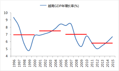 近年世界主要國(guó)家和地區(qū)包括中國(guó)在內(nèi)普遍遭遇發(fā)展困境,增長(zhǎng)率普遍下滑,當(dāng)大家的目光一致聚集在印度是否能替代中國(guó)成為世界經(jīng)濟(jì)發(fā)展的新引擎時(shí),另一個(gè)國(guó)家正悄然崛起。這個(gè)曾經(jīng)大家都看不起眼的國(guó)家越南憑借著優(yōu)越的地理位置、年輕不斷增加的人口優(yōu)勢(shì)等在2015年取得接近7%的經(jīng)濟(jì)增長(zhǎng)率,成為世界經(jīng)濟(jì)發(fā)展最快的國(guó)家之一。據(jù)越南國(guó)家統(tǒng)計(jì)總局發(fā)布的數(shù)據(jù),2015年越南GDP約4193萬(wàn)億盾(約合1906億美元),同比增長(zhǎng)6.68%,創(chuàng)五年來(lái)新高。根據(jù)經(jīng)濟(jì)與合作發(fā)展組織(OECD)預(yù)測(cè),2016年越南GDP增長(zhǎng)率將為6.3%,2017年下調(diào)至6.1%,盡管如此,未來(lái)仍將繼續(xù)領(lǐng)跑東南亞地區(qū)經(jīng)濟(jì)增長(zhǎng)。