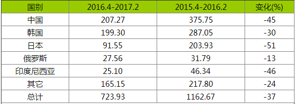 對印度三大出口國中國、韓國和日本受沖擊最為明顯。2016年4月至2017年2月,中國對印度總計出口鋼材207萬噸,降45%,韓國出口199萬噸,降30%,日本99.55萬噸,降51%。其中,韓國對印度熱卷出口79.74萬噸,同比降32%,日本出口45.05萬噸,降60%。