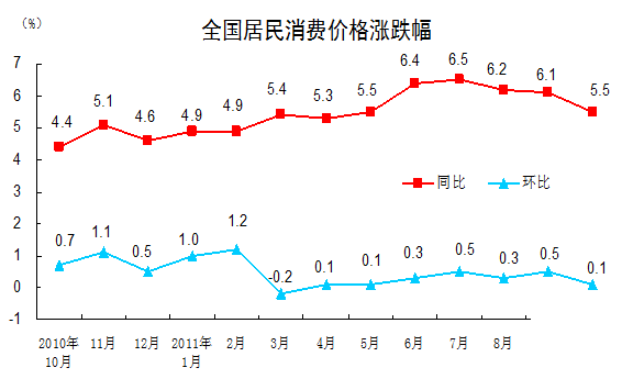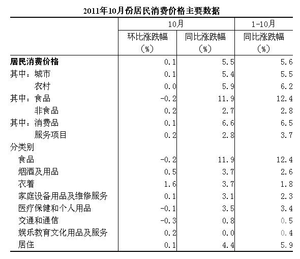 2011年10月份,全國(guó)居民消費(fèi)價(jià)格總水平同比上漲5.5%。其中,城市上漲5.4%,農(nóng)村上漲5.9%;食品價(jià)格上漲11.9%,非食品價(jià)格上漲2.7%;消費(fèi)品價(jià)格上漲6.6%,服務(wù)項(xiàng)目?jī)r(jià)格上漲2.8%。全國(guó)居民消費(fèi)價(jià)格總水平環(huán)比上漲0.1%。其中,城市上漲0.1%,農(nóng)村與上月持平;食品價(jià)格下降0.2%,非食品價(jià)格上漲0.2%;消費(fèi)品價(jià)格上漲0.1%,服務(wù)項(xiàng)目?jī)r(jià)格上漲0.2%。