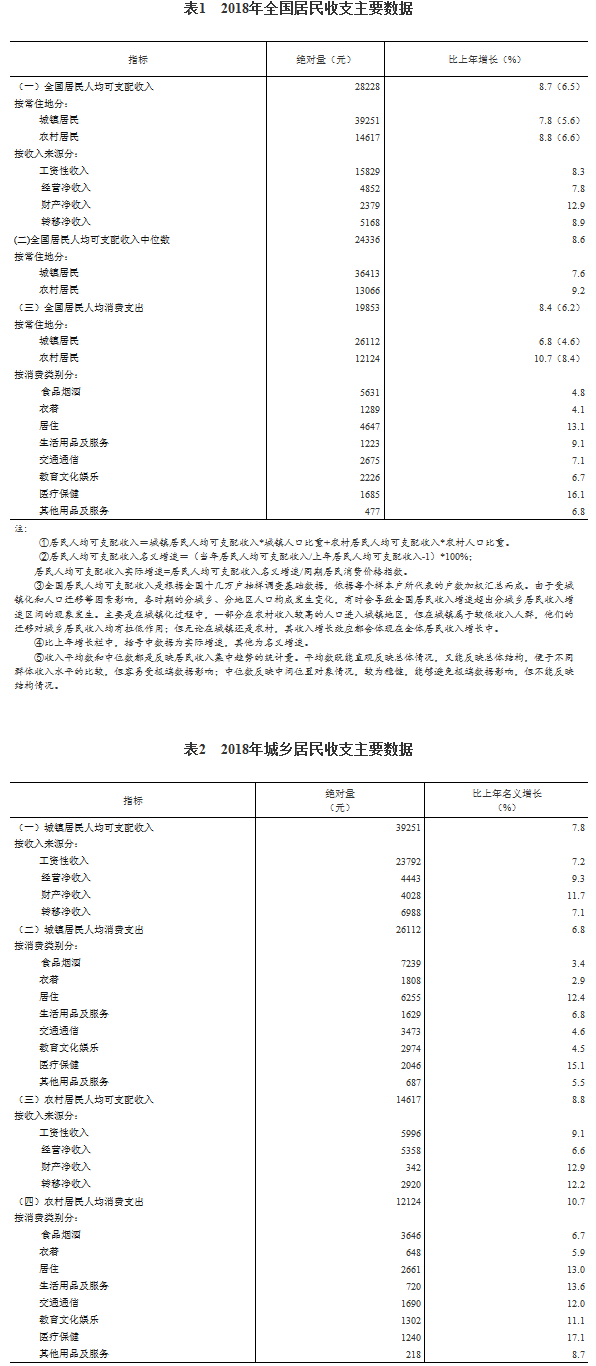 2018年,全國居民人均可支配收入28228元,比上年名義增長8.7%,扣除價(jià)格因素,實(shí)際增長6.5%。其中,城鎮(zhèn)居民人均可支配收入39251元,增長(以下如無特別說明,均為同比名義增長)7.8%,扣除價(jià)格因素,實(shí)際增長5.6%;農(nóng)村居民人均可支配收入14617元,增長8.8%,扣除價(jià)格因素,實(shí)際增長6.6%。