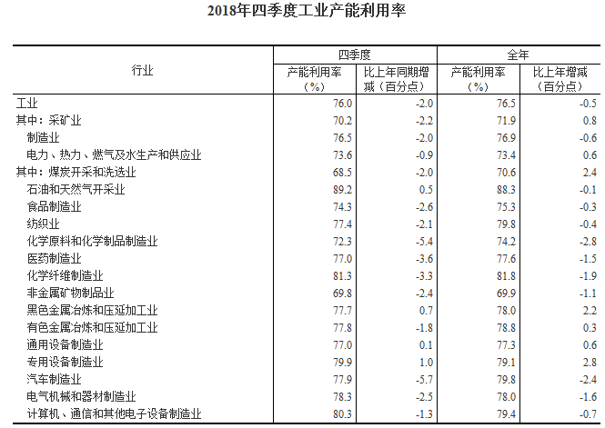 2018年四季度,全國工業(yè)產(chǎn)能利用率為76.0%,比上年同期下降2.0個百分點。2018年全國工業(yè)產(chǎn)能利用率為76.5%,比上年下降0.5個百分點。