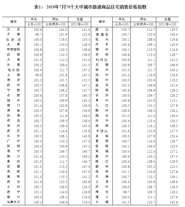 上證報(bào)中國(guó)證券網(wǎng)訊 據(jù)國(guó)家統(tǒng)計(jì)局8月15日消息,國(guó)家統(tǒng)計(jì)局今日發(fā)布了2019年7月份70個(gè)大中城市商品住宅銷(xiāo)售價(jià)格變動(dòng)情況統(tǒng)計(jì)數(shù)據(jù)。對(duì)此,國(guó)家統(tǒng)計(jì)局城市司高級(jí)統(tǒng)計(jì)師劉建偉進(jìn)行了解讀,一二線城市新建商品住宅和二手住宅銷(xiāo)售價(jià)格環(huán)比漲幅略有升降;三線城市漲幅均與上月相同。