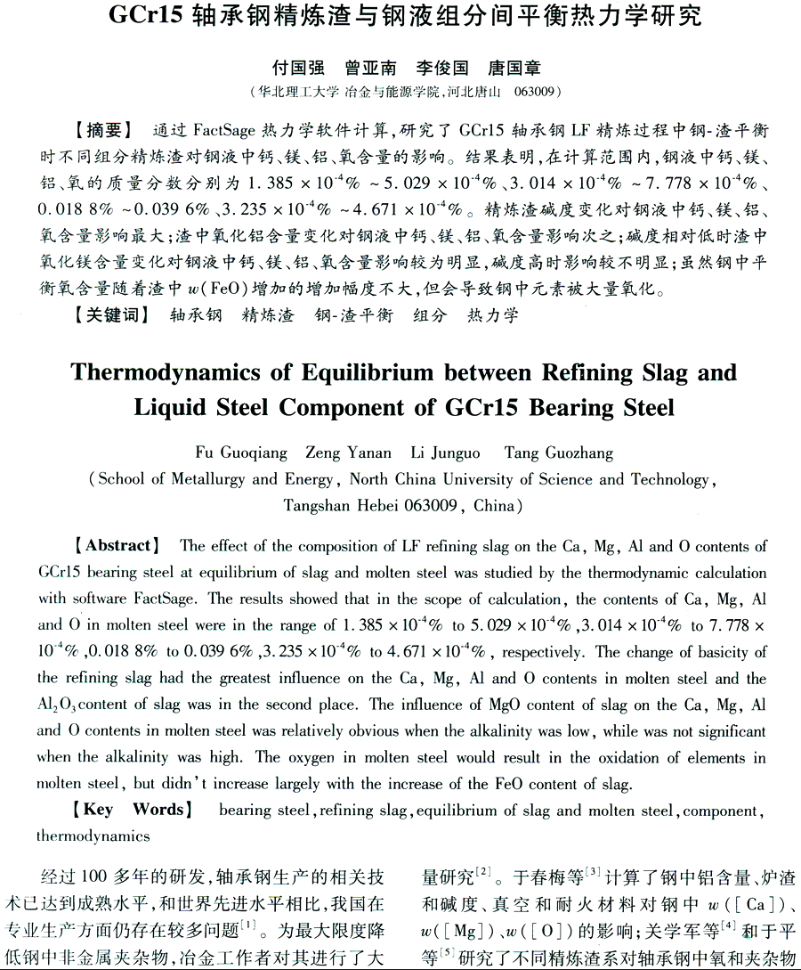 GCr15軸承鋼精煉渣與鋼液組分間平衡熱力學研究