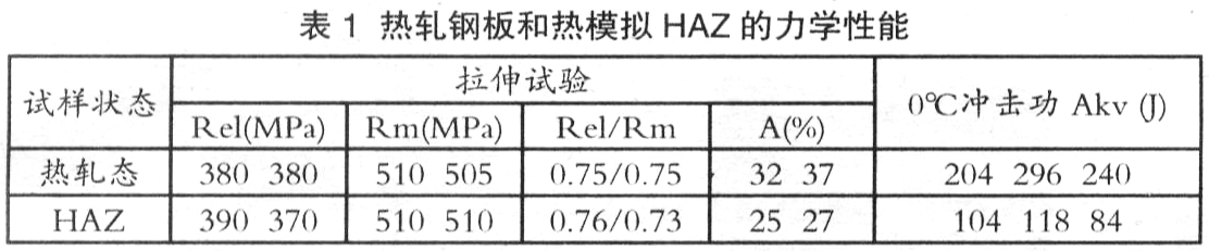 表1為熱軋態(tài)鋼板和100kJ/cm大線能量焊接熱模擬HAZ常溫拉伸和0℃扣擊試驗結果。從表1可見,熱軋態(tài)鋼板屈強比為0.75,遠低于日前國內外通用標準所要求的0.80;具備較低的屈強比,且強韌性匹配良好;HAZ強度與熱軋態(tài)鋼板試驗結果相比基本一致,可見經大線能量焊接熱模擬后HAZ沒有發(fā)生軟化現象。而且0℃沖擊試驗結果最低84J,遠高于設計要求(0℃沖擊功Akv≥47J)。