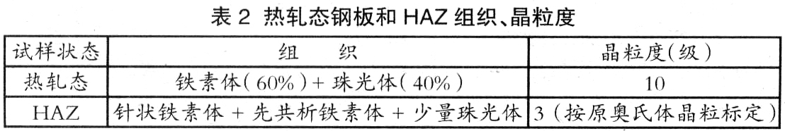 熱軋態(tài)鋼板和HAZ金相組織和晶粒度檢驗結果見表2,組織評定按GB/T13299—1991《鋼的顯微組織評定方法》標準規(guī)定執(zhí)行,晶粒度測定按GB6394—1986《金屬平均晶粒度測定法(A)》標準規(guī)定執(zhí)行。由表2的試驗結果可見:熱軋態(tài)鋼板組織為鐵素體 珠光體組織,且其中相對低硬度相(鐵素體相)占60%。這種強弱相匹配的雙相組織結構使鋼板在獲得較好的強韌性匹配的同時,還得到較低的屈強比。HAZ組織為針狀鐵素體 先共析鐵素體 珠光體混合組織,對比熱軋態(tài)HAZ原奧氏體晶粒發(fā)生了較大程度的粗化,但晶內組織比較細小。3.2.2 HAZ斷口掃描電鏡組織