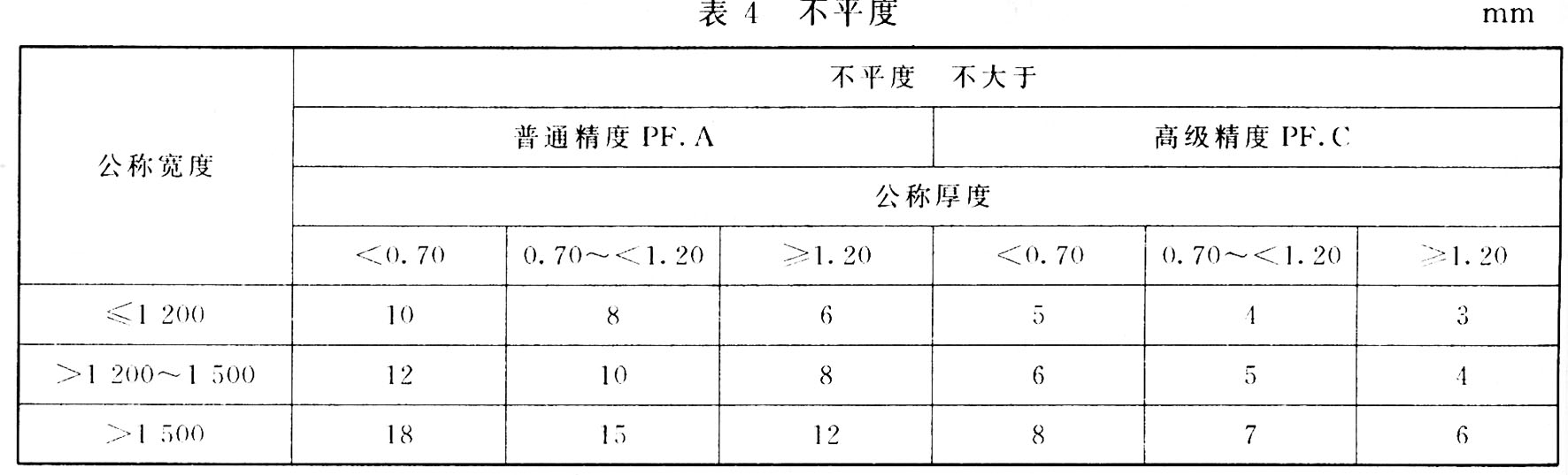 錒板每米不平度應符合表4的規(guī)定。鋼板不平度系將鋼板自由地放在平臺上,鋼板下表面和平臺之間最大距離。