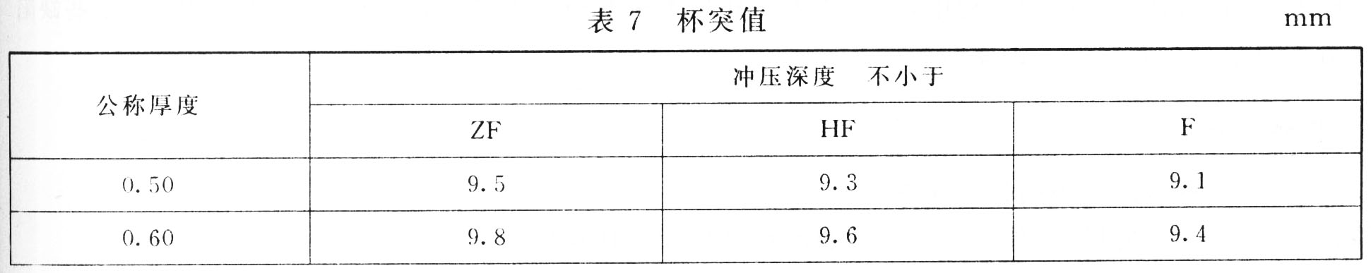 厚度不大于2 mm的SCl鋼板及鋼帶在供貨狀態(tài)下進行杯突試驗,杯突值(沖壓深度)應符合表7的規(guī)定。經(jīng)過協(xié)商并在合同中注明,可用n、r值代替杯突值。